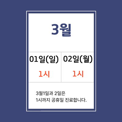 3월 1일,2일(일/월)은 1시까지 공휴일진료