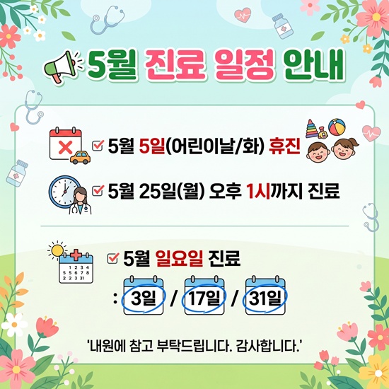 ✔ 5월 25일(월/대체공휴일) 오후 1시까지 진료